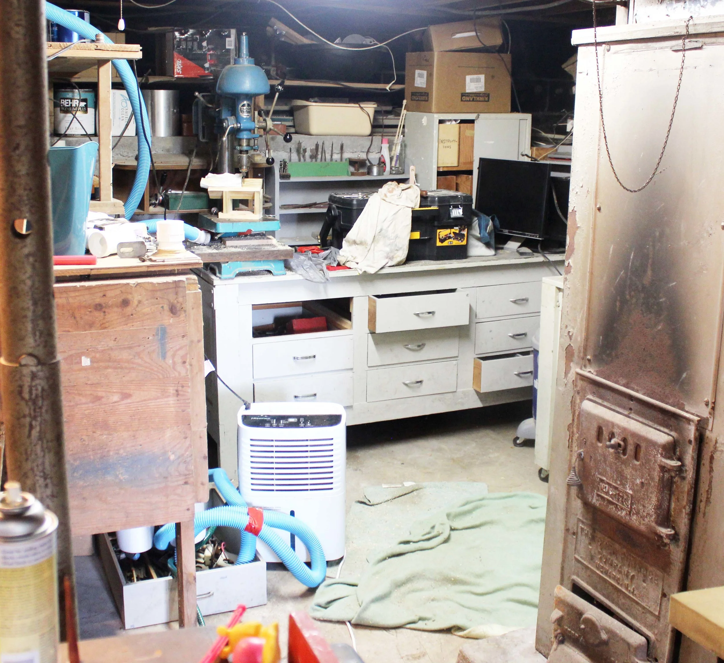 Messy shot of some of the old, inherited tool benches. That's the drill press along with a nifty little contraption Zach put together for making flange slits. Also a super old-school coal oven on the right, but upstairs it has an amazingly beautiful iron grate in the hardwood floor!