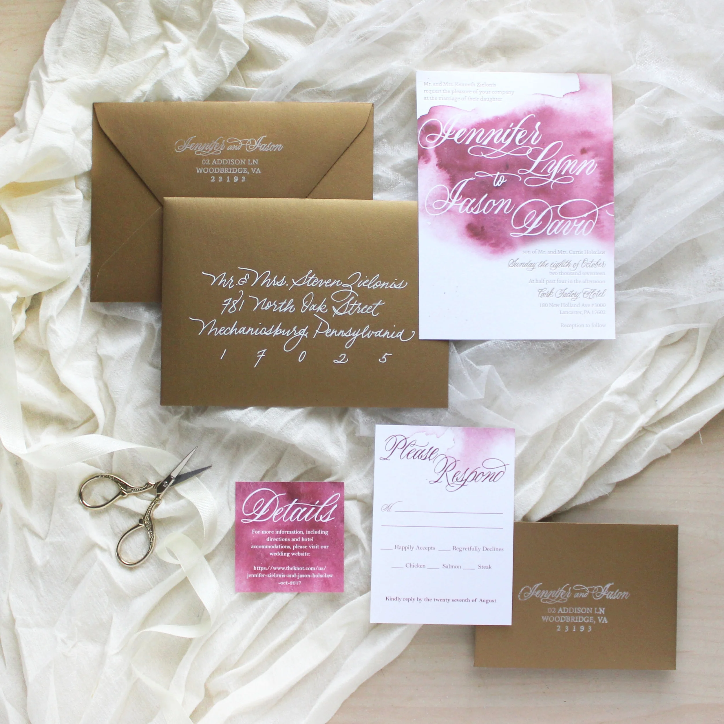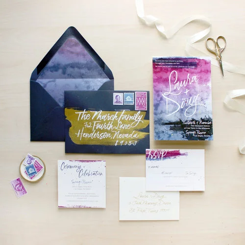 Is it the thing you want it to be attracted to first? If it's your biggest invite, or envelope, that makes sense. But if it's a brightly colored ribbon in the corner that doesn't make sense. You also don't want to overwhelm the eye - have one or two big, captivating pieces that stand out the most and let the others fade into the background as secondary items. If the suite is very busy, patterned or colorful, try to keep surrounding colors and accessories more muted and subdued so your work takes the center stage. On the flip side, if the suite is a simplified piece, try creating a stand-out image by playing up the surrounding areas with florals or stamps. - After the initial grab, where does your eye travel?